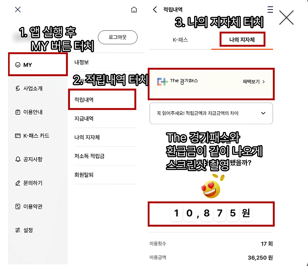 - 홈페이지 내 MY 페이지에서 적립내역을 확인한 후, 나의 지자체 항목을 스크린샷으로 촬영합니다.