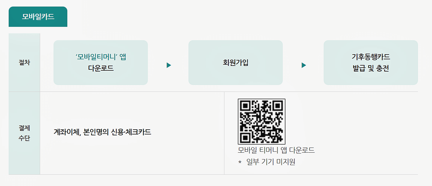 티머니 앱을 다운로드하고 설치한 후, 앱 내에서 기후동행카드를 신청하고 결제하여 모바일 카드로 이용 가능