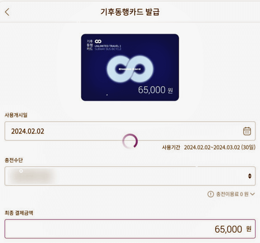 - 충전 금액을 선택합니다. 기후동행카드는 정기권 형태이므로 사용 기간에 따라 충전 금액이 다를 수 있습니다.