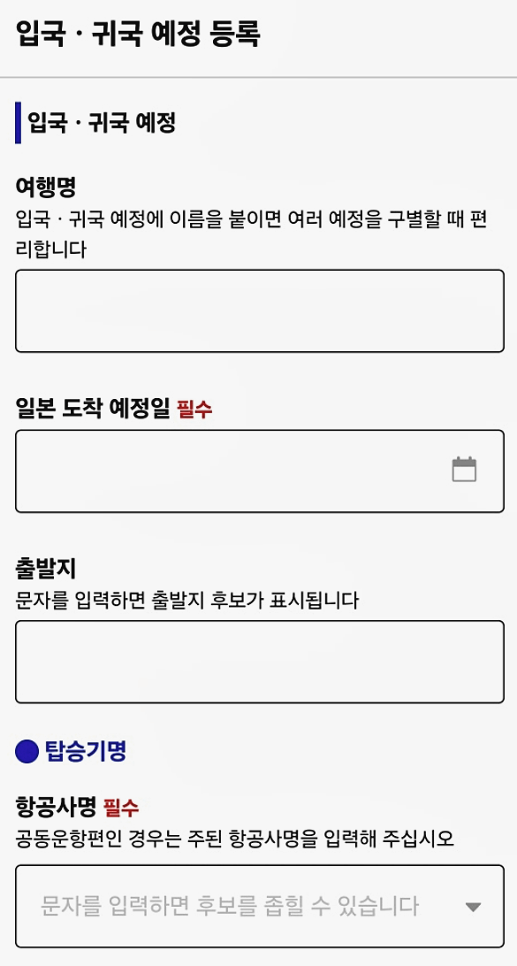 - 숙소 정보: 일본에서 머무를 숙소의 주소와 연락처를 입력합니다.