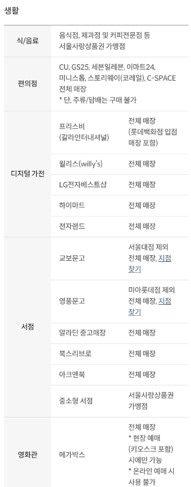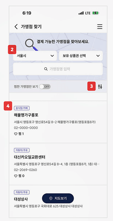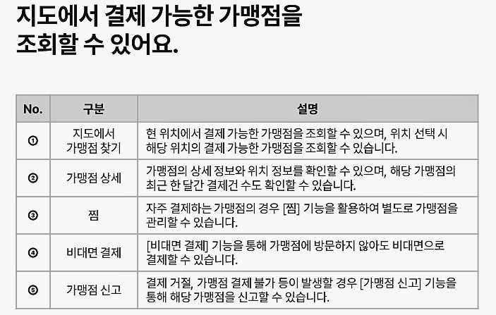 - 검색 : 원하는 카테고리나 지역을 선택하여 사용 가능한 가맹점을 검색합니다.