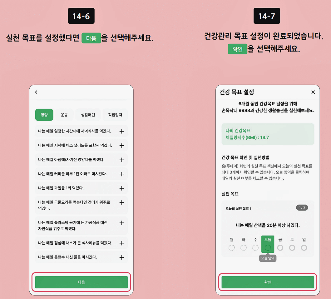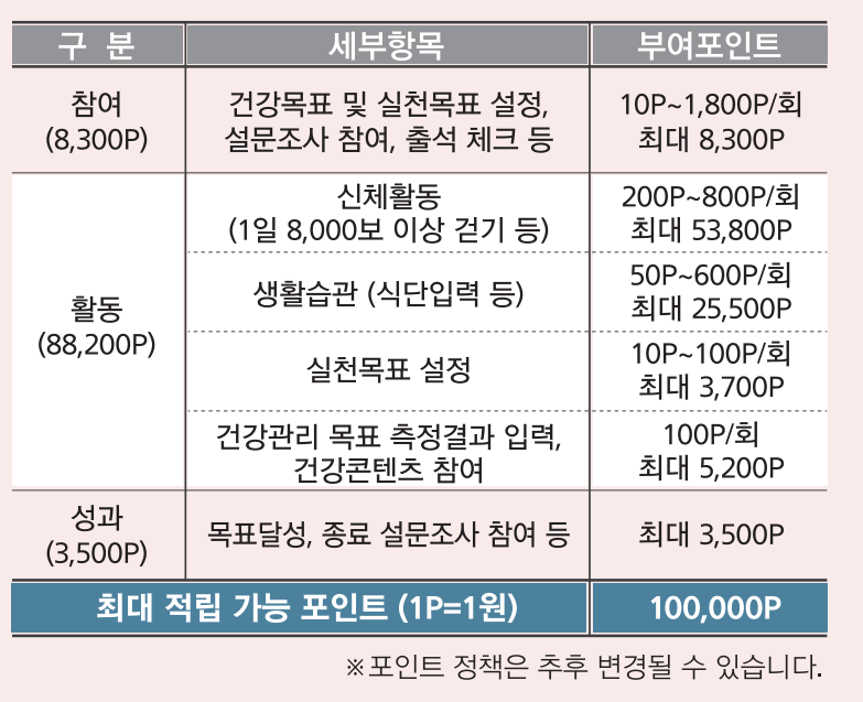 - 미션 완료 : 프로그램에서 제공하는 다양한 건강 미션을 수행하여 보너스 포인트를 받을 수 있습니다.