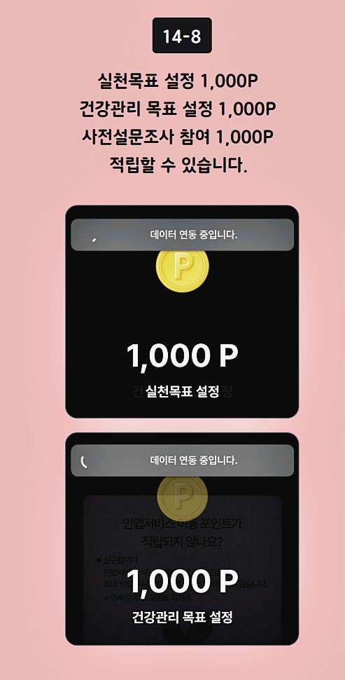 - 건강 체크 : 정기적인 건강 상태 체크와 기록을 통해 추가 포인트를 획득할 수 있습니다.