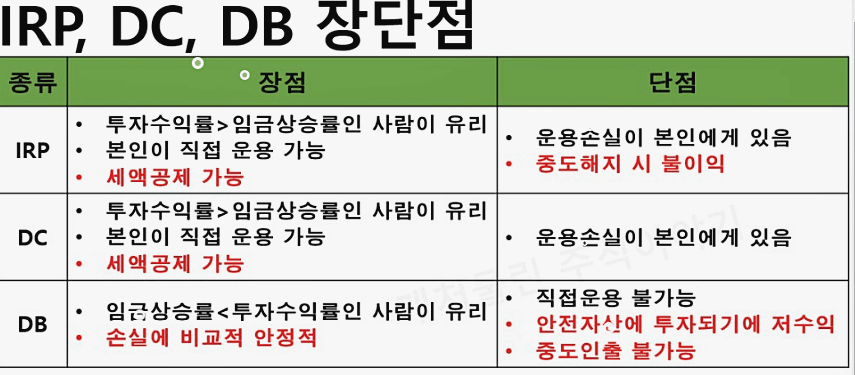 - 퇴직연금 : DB형은 회사, DC형과 IRP형은 근로자가 운용 책임을 가짐