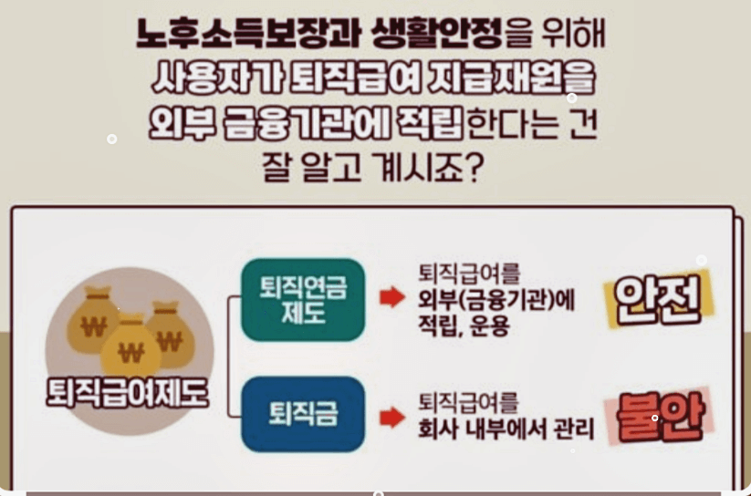 - 퇴직연금 : 법적 보호를 받으며, 일정 요건 충족 시 가입이 의무화됨